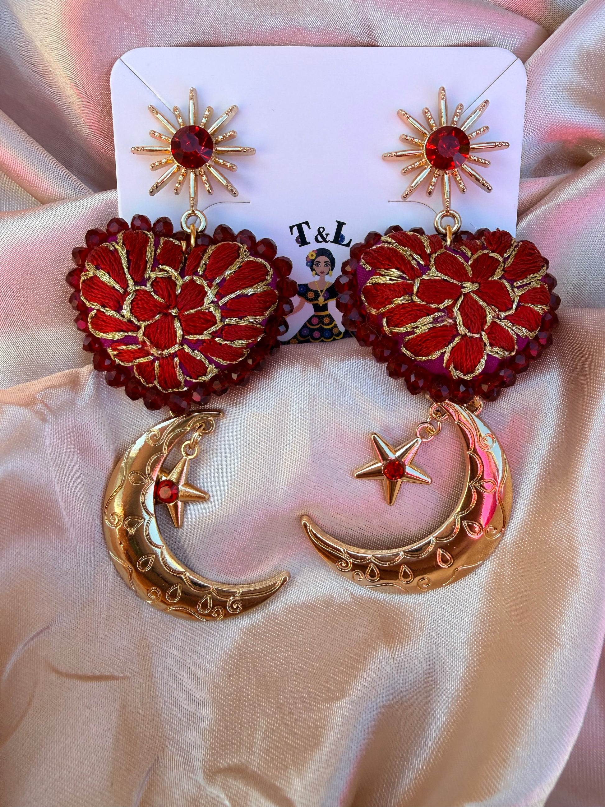 ) Aretes bordados a mano / aretes san Antonino/ hand made jewelry/ aretes luna/ aretes rojos/