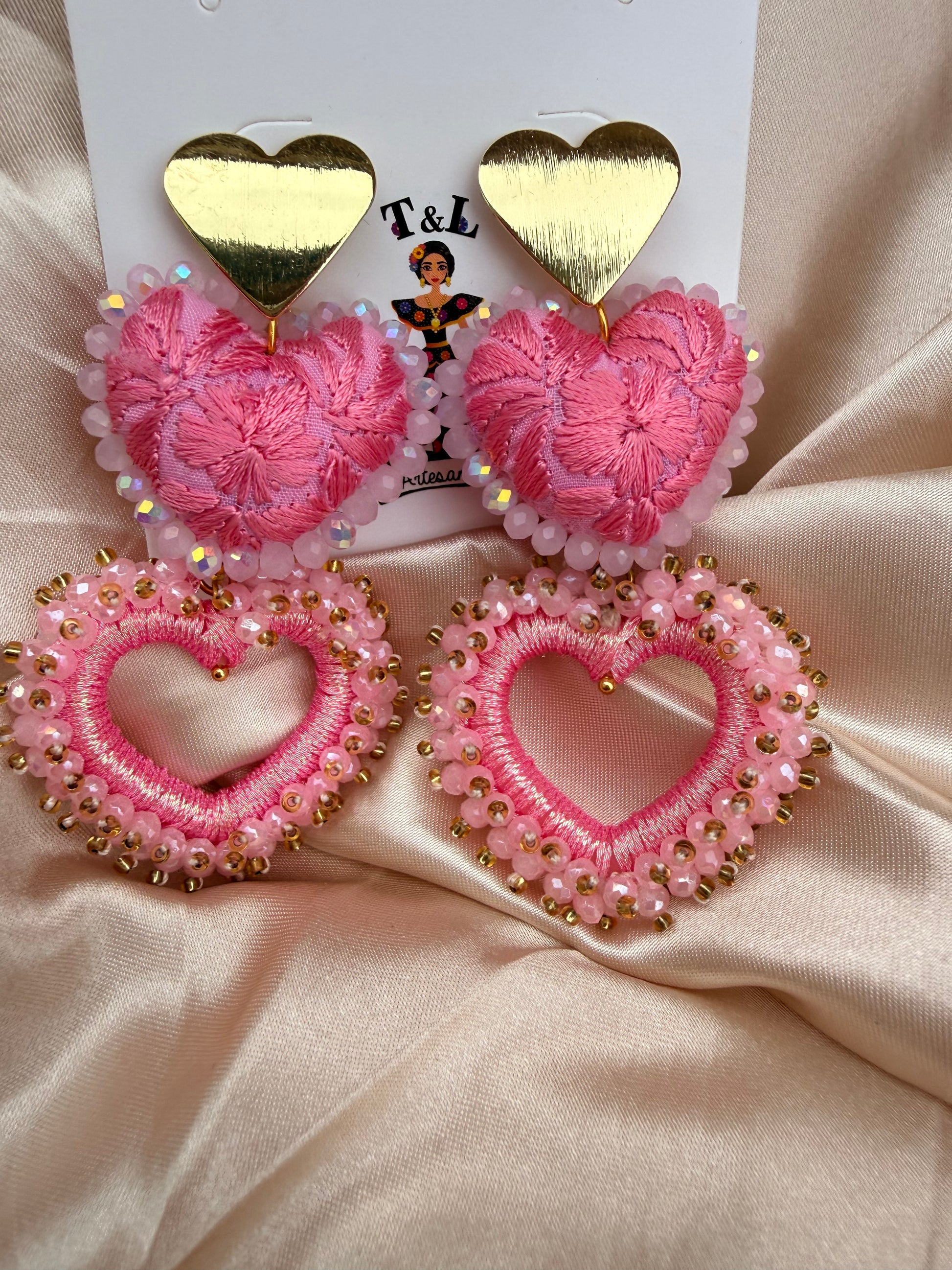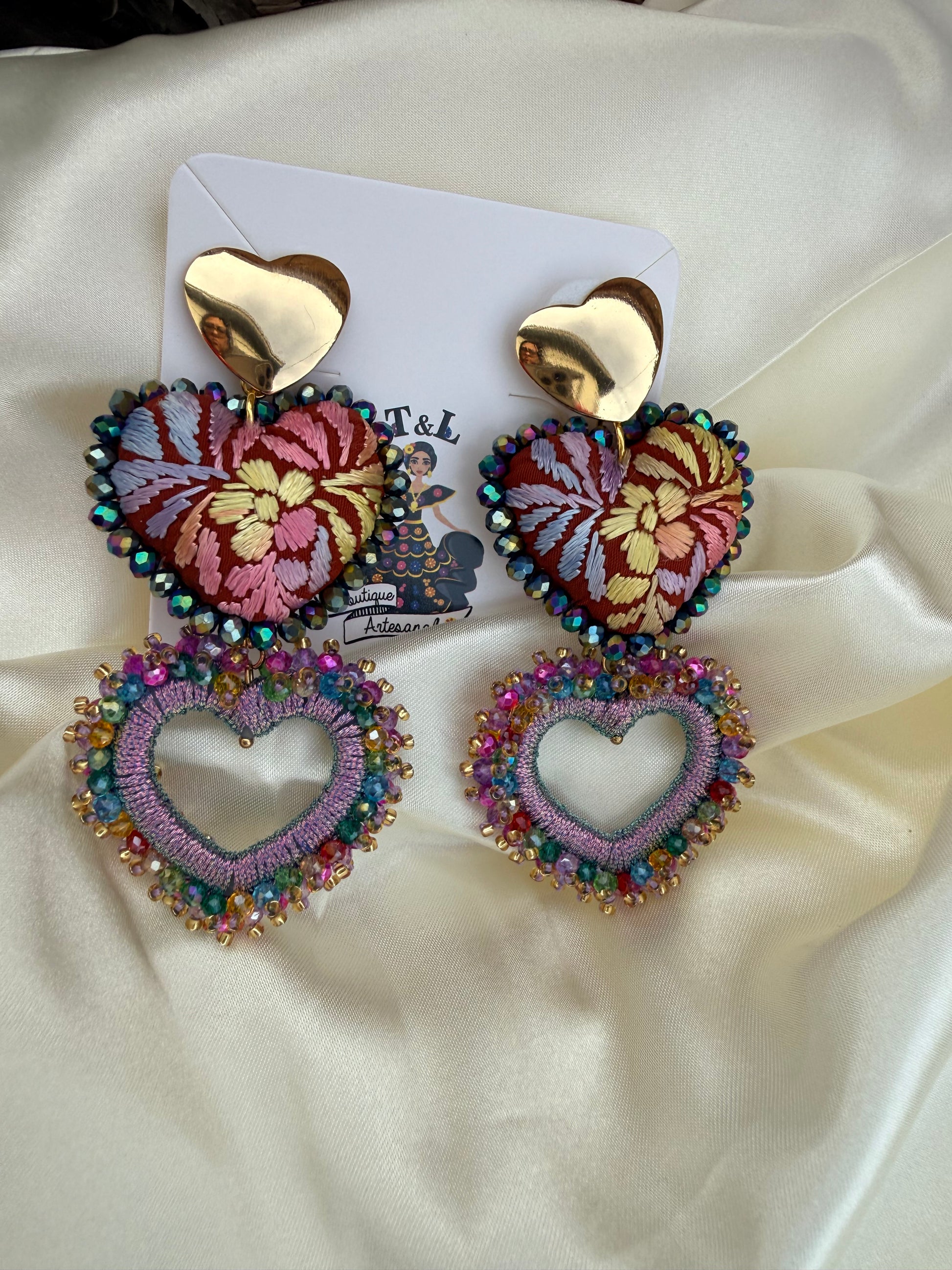 Aretes bordados a mano / aretes san Antonino/ hand made jewelry/ aretes de corazon/ aretes de moda/rosita/tornasol color.