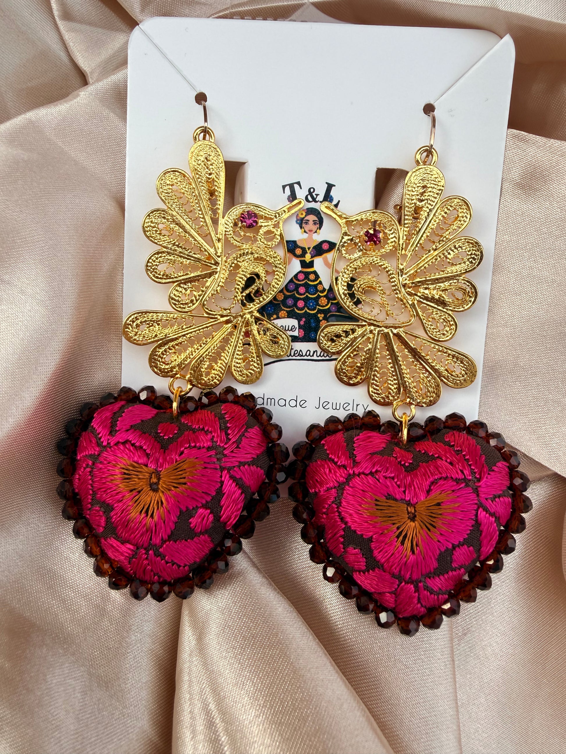 El corazón bordado está cuidadosamente enmarcado con cristales decorativos que aportan brillo y sofisticación, mientras que la filigrana dorada del colibrí añade un toque único y cultural. Al ser joyería hecha a mano, cada par es una pieza irrepetible, creada con dedicación y amor por el detalle.