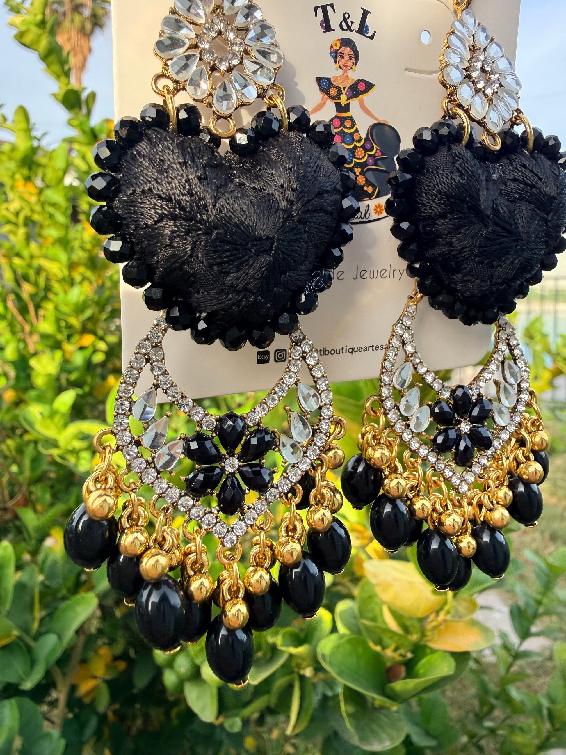 Aretes bordados de corazones / aretes bordados san Antonino/hand made jewelry/ negros