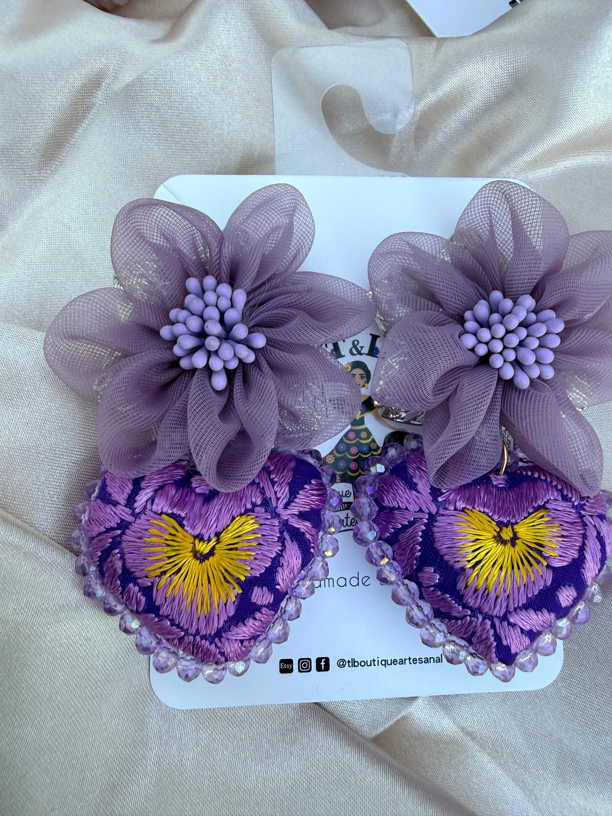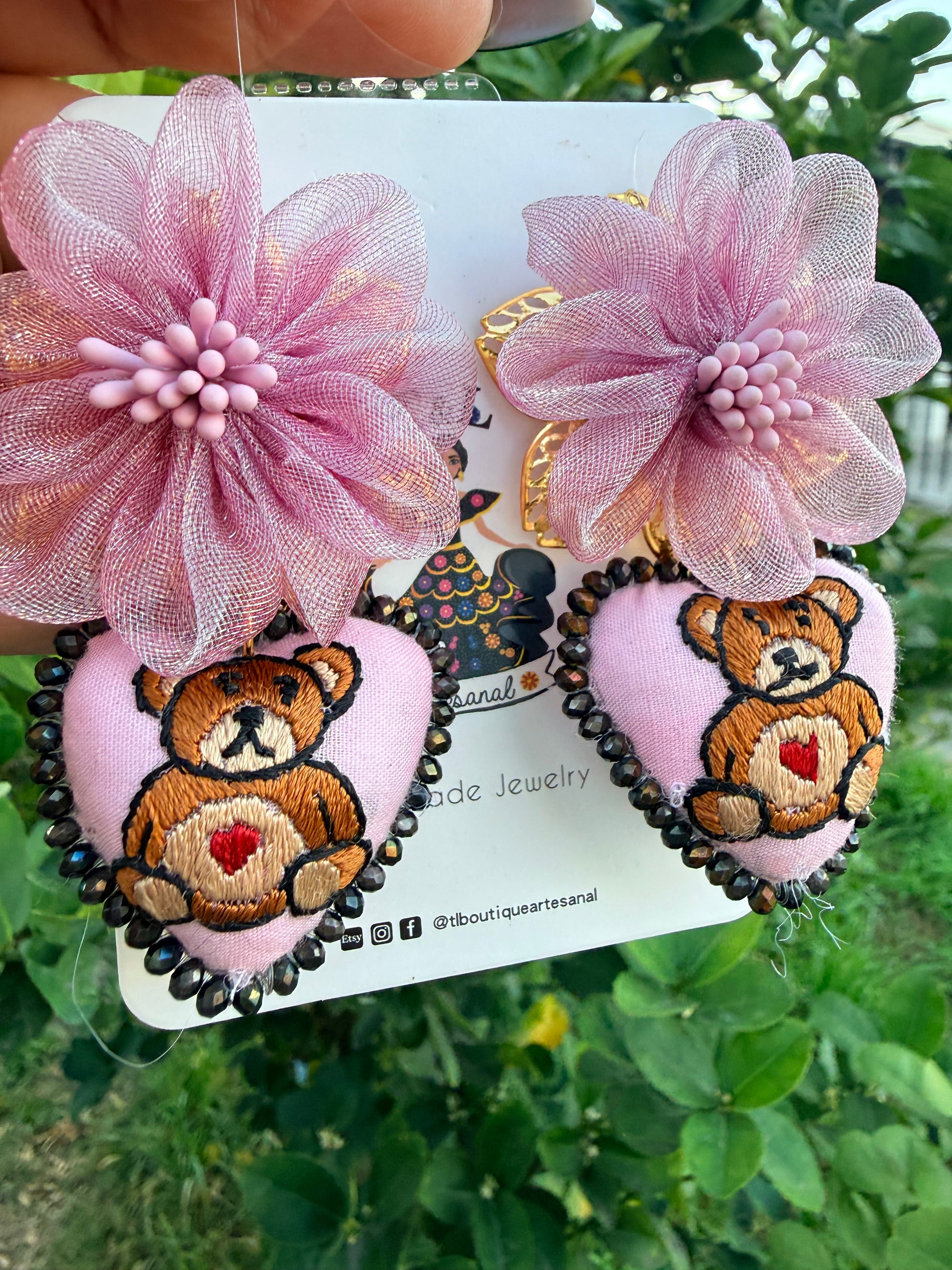 Destaca con estos aretes únicos de corazón bordados a mano, elaborados cuidadosamente en un vibrante tono rosa fuerte que transmite personalidad y estilo. Cada pieza está complementada con una hermosa flor hecha completamente a mano, del mismo color, creando un diseño armonioso y lleno de encanto.