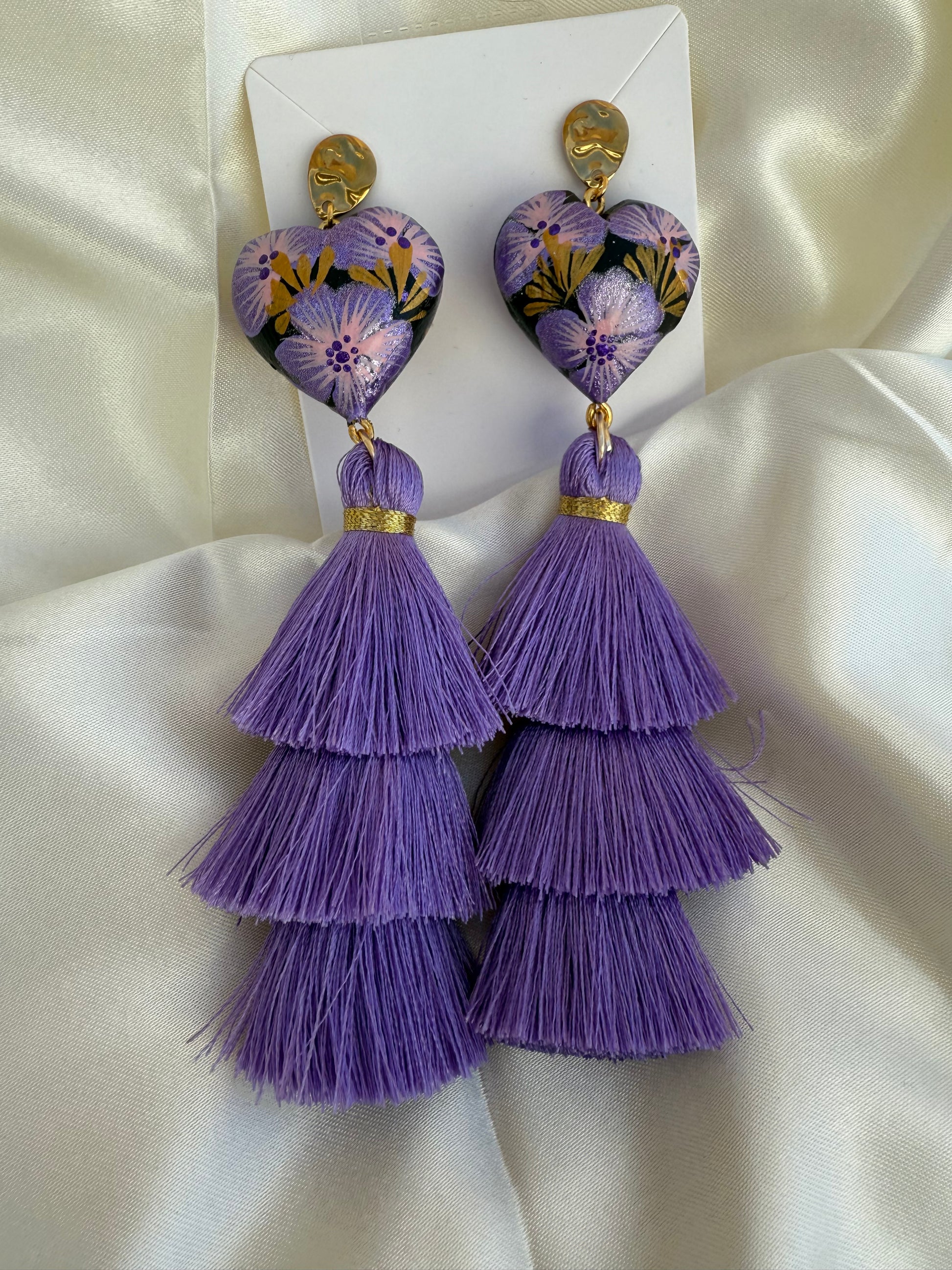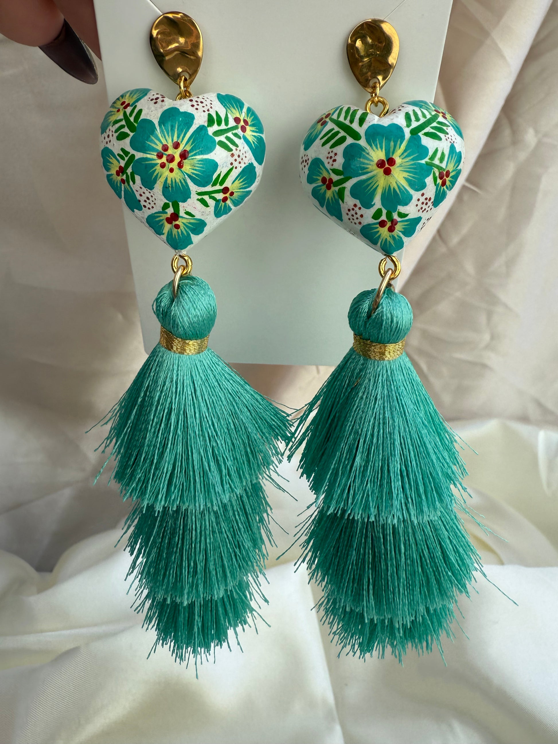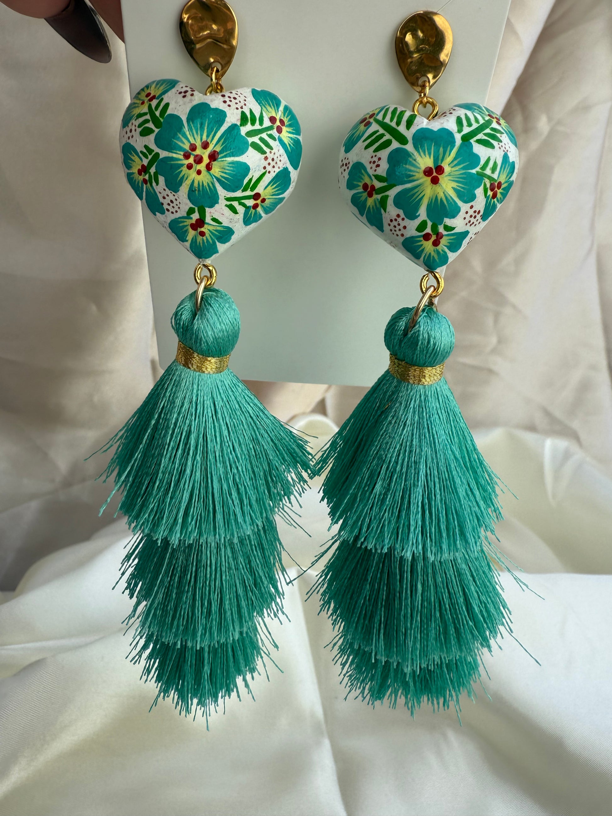 Aretes de Corazon de madera de copal /con borlas de hilos de ceda
