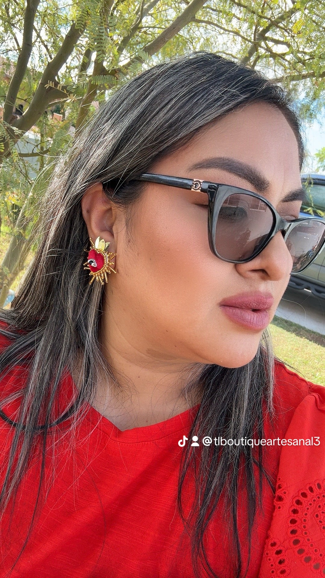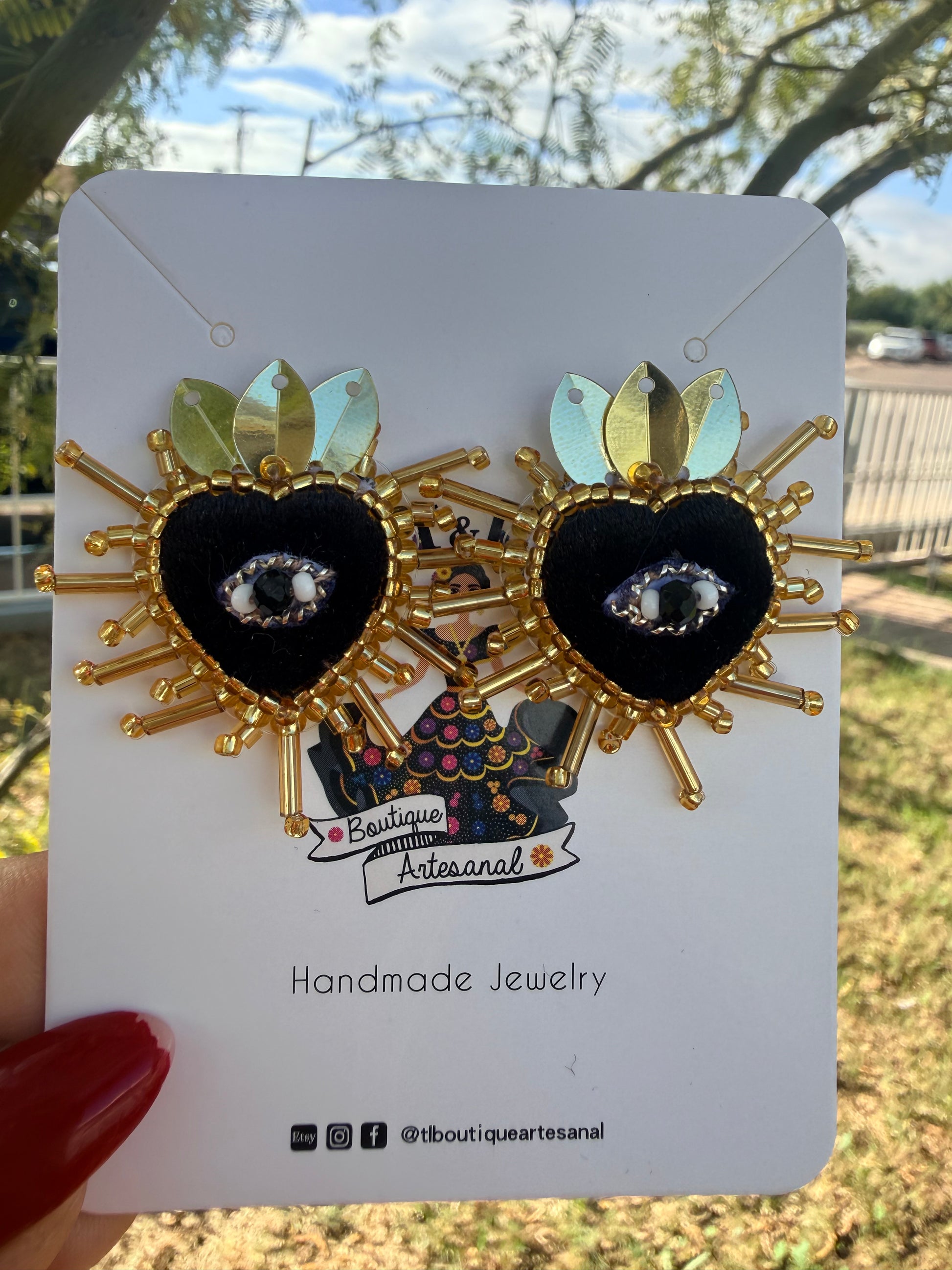 Aretes artesanales en forma de sagrado corazon con ojo.