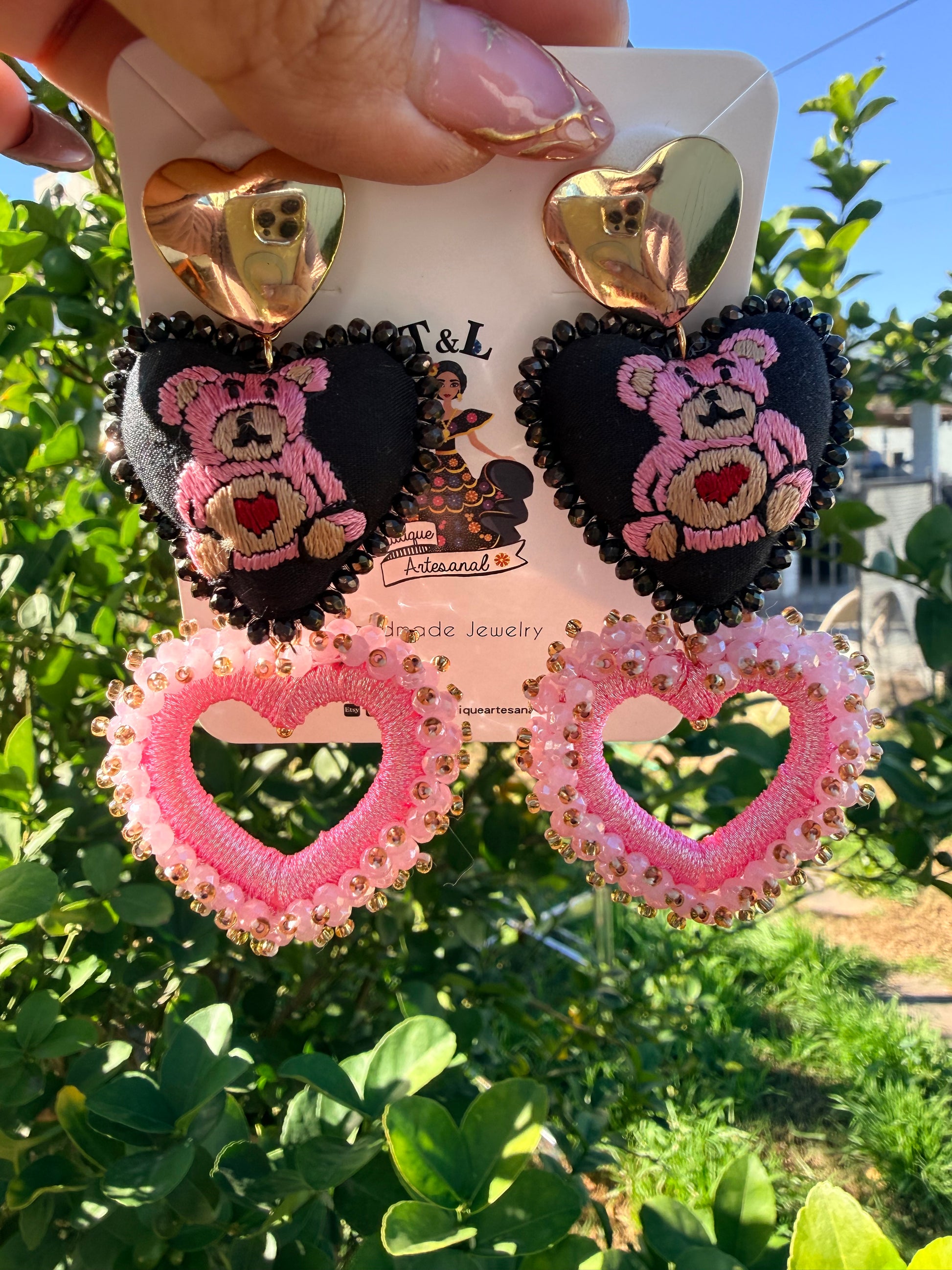 Osito/ rosa con negro /aretes bordado a mano , /handmade jewelry