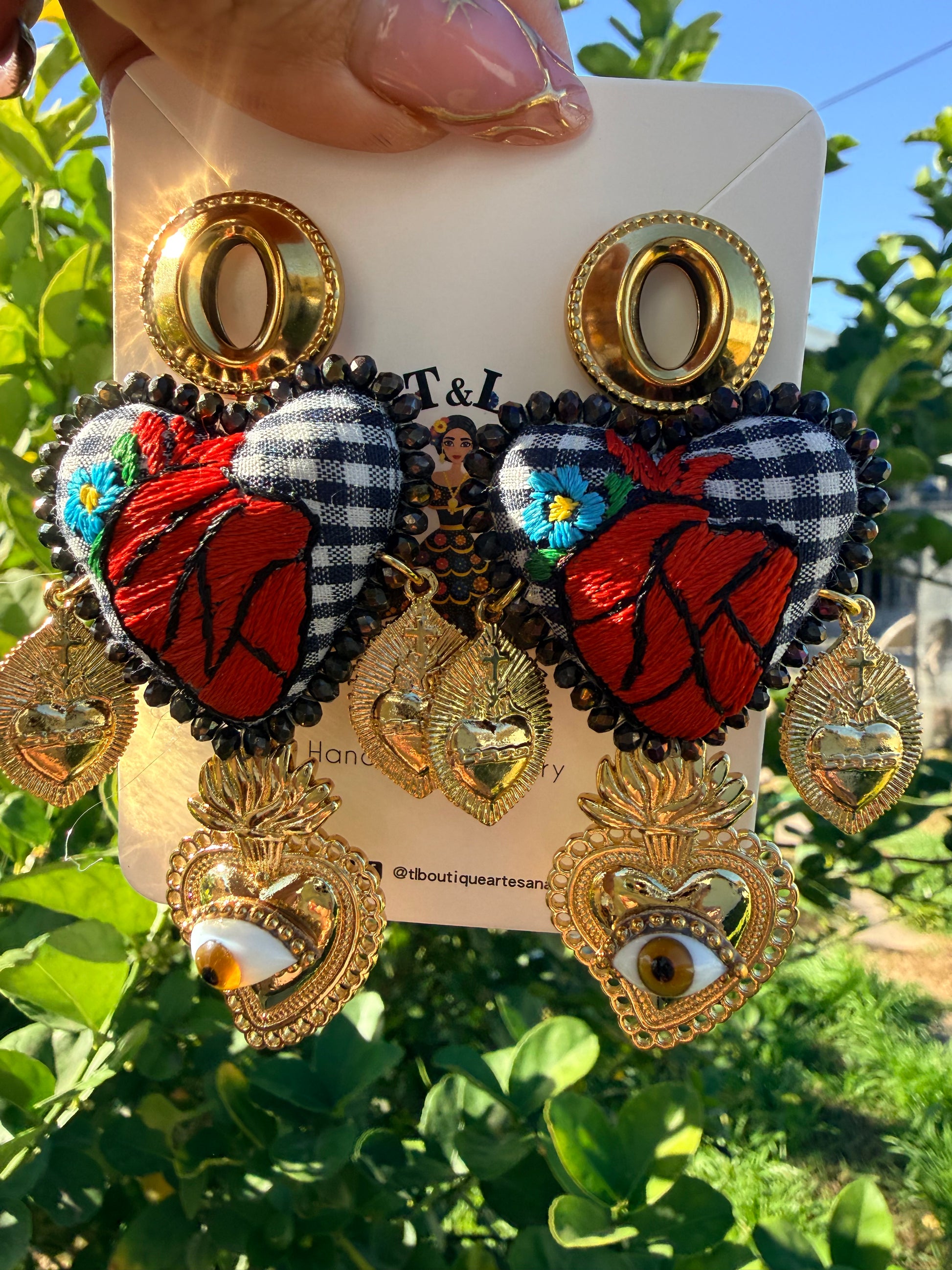 Bordados a mano con complemente con aretes de milagritos ,corazon en acero inoxidable fashion