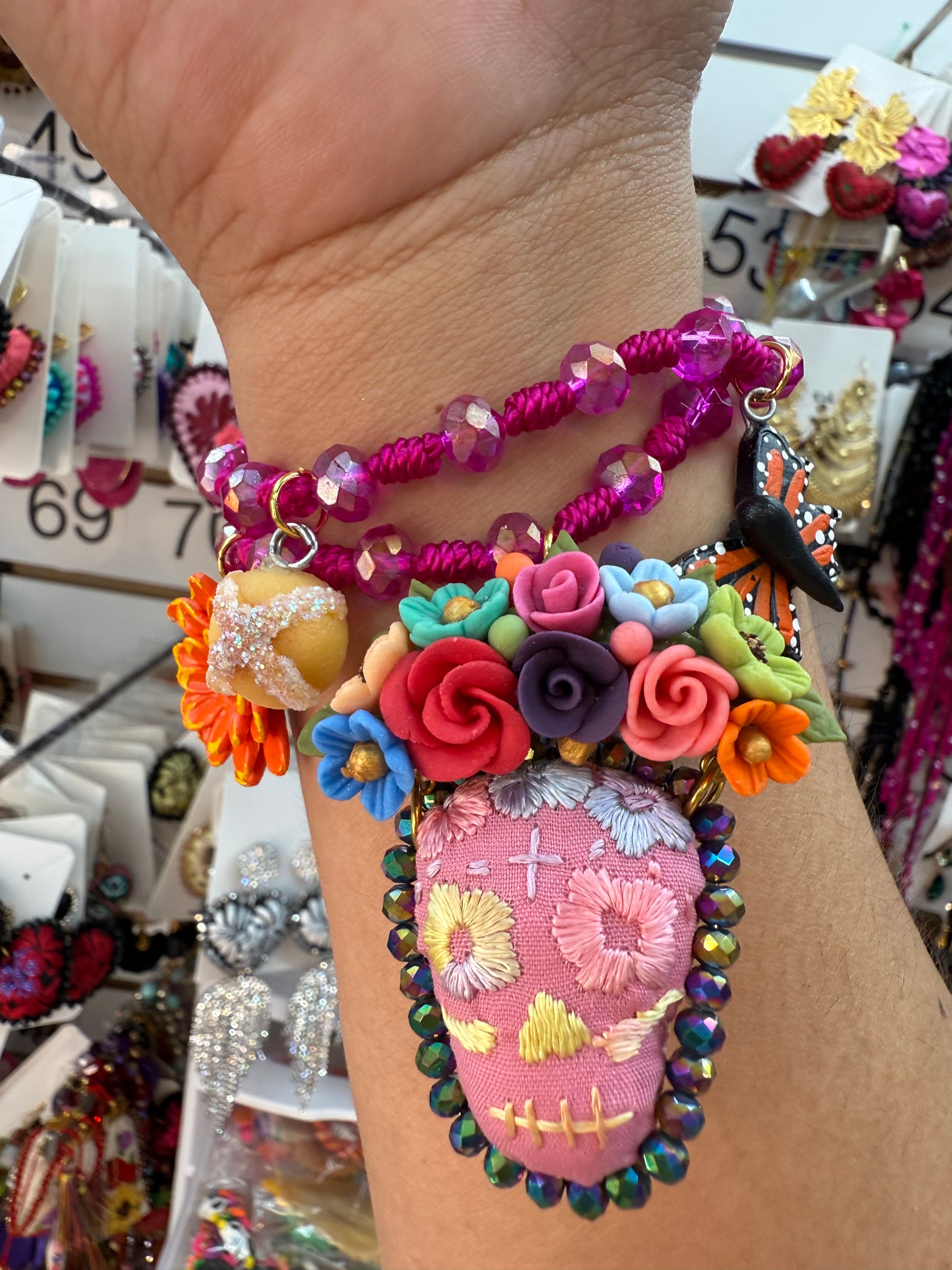 Pulcera ajustable de hilos y cristal checo , adornada con dijes de pasta flexible con tematica de dia de muertos . Cultura mexicana ❤️