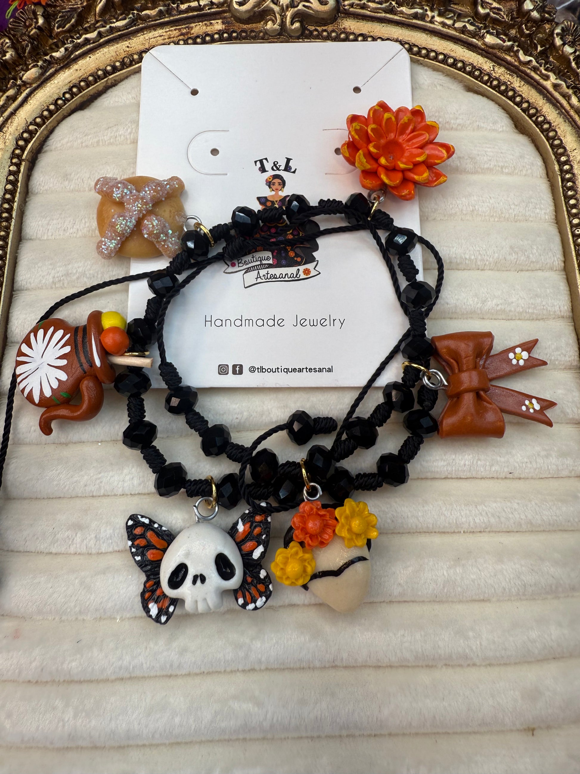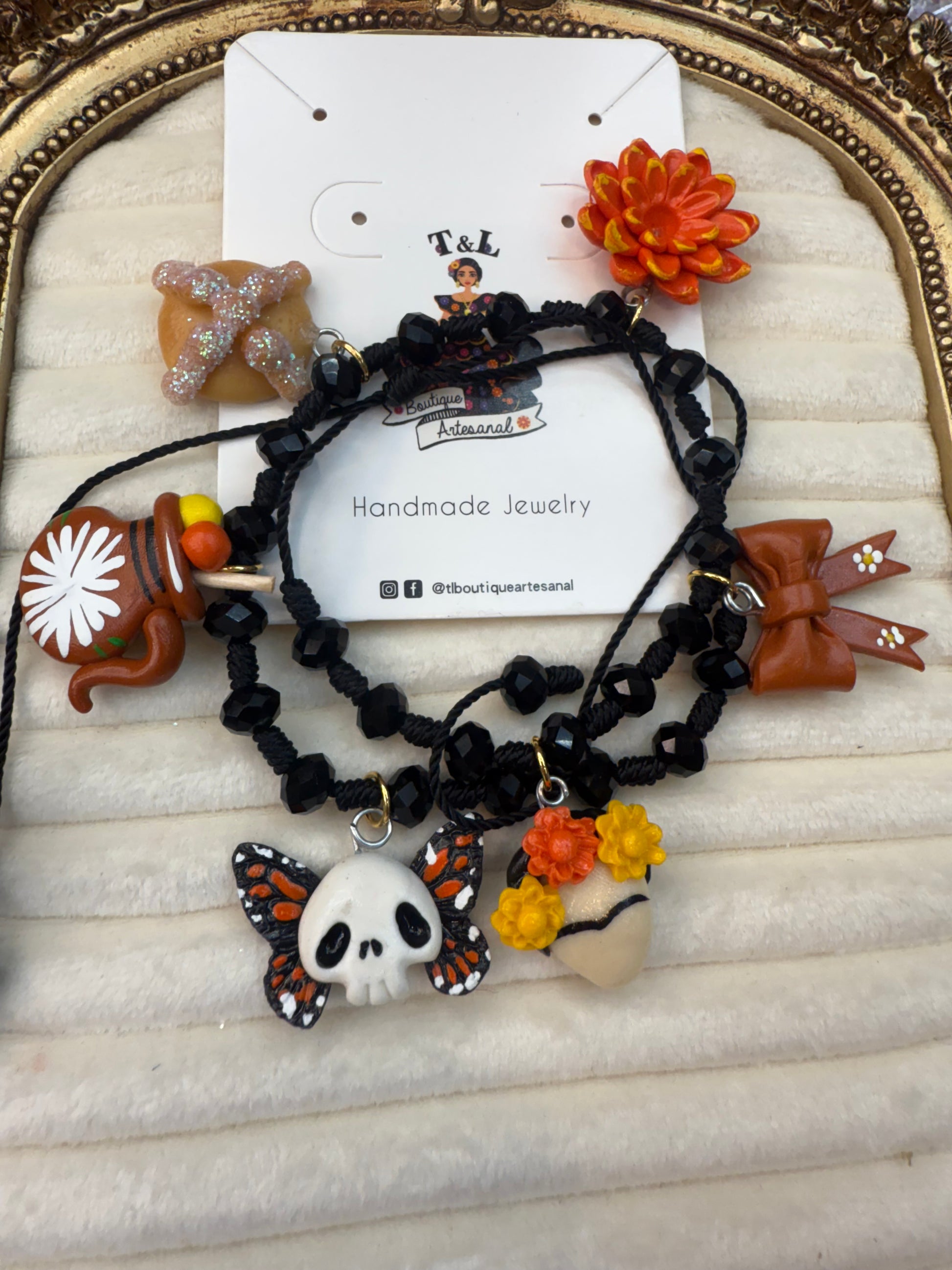 Pulcera ajustable de hilos y cristal checo , adornada con dijes de pasta flexible con tematica de dia de muertos . Cultura mexicana ❤️