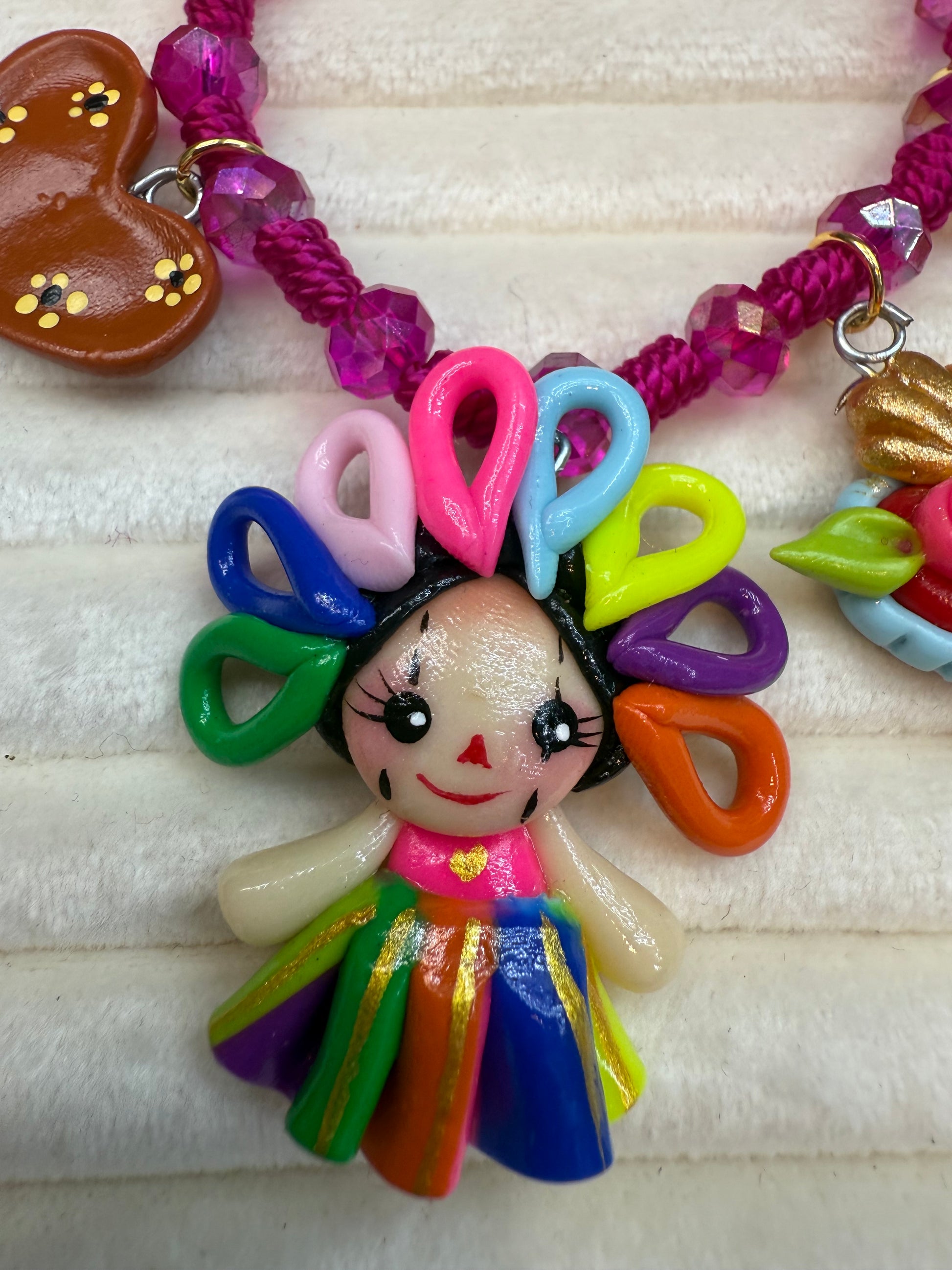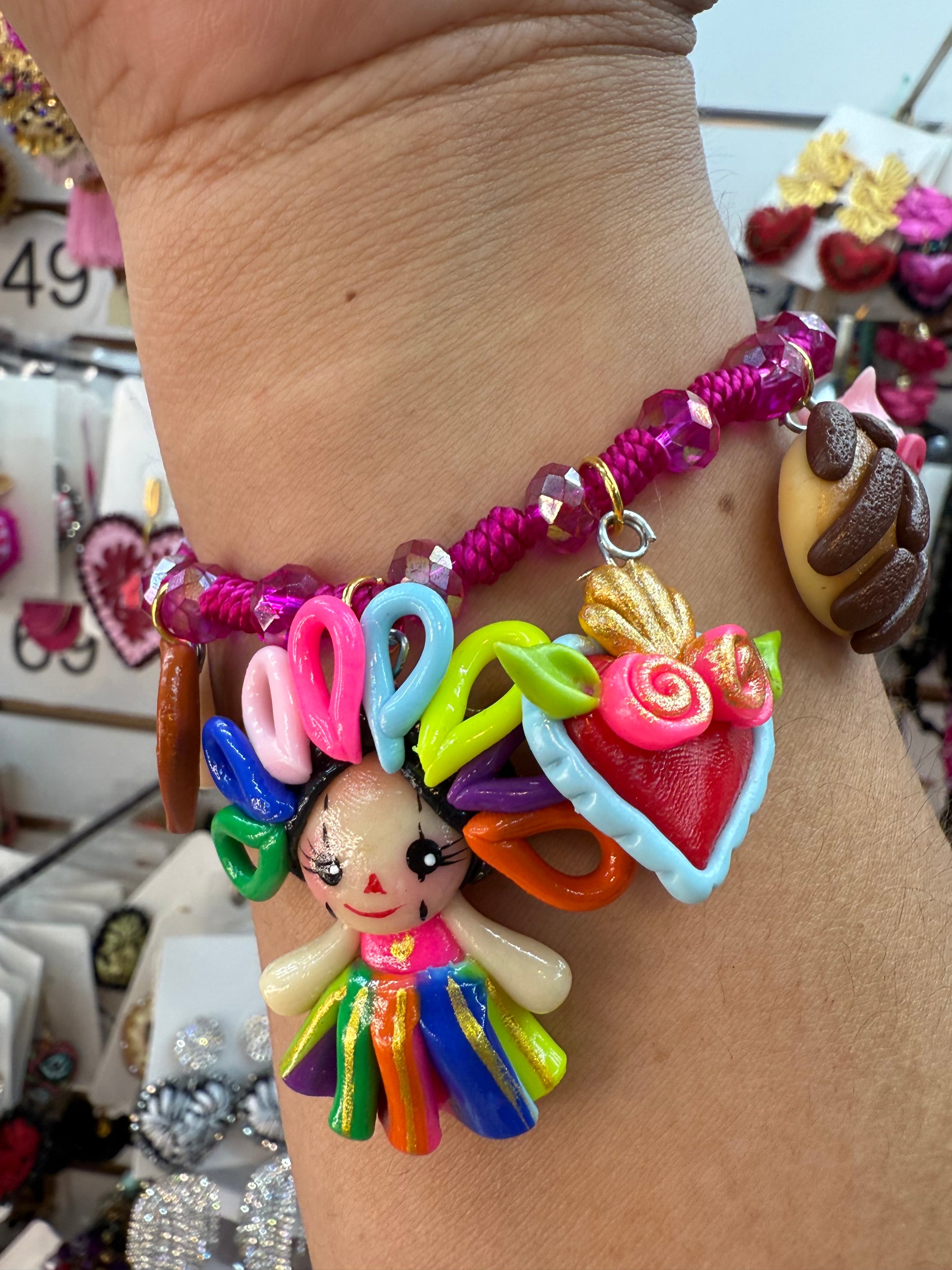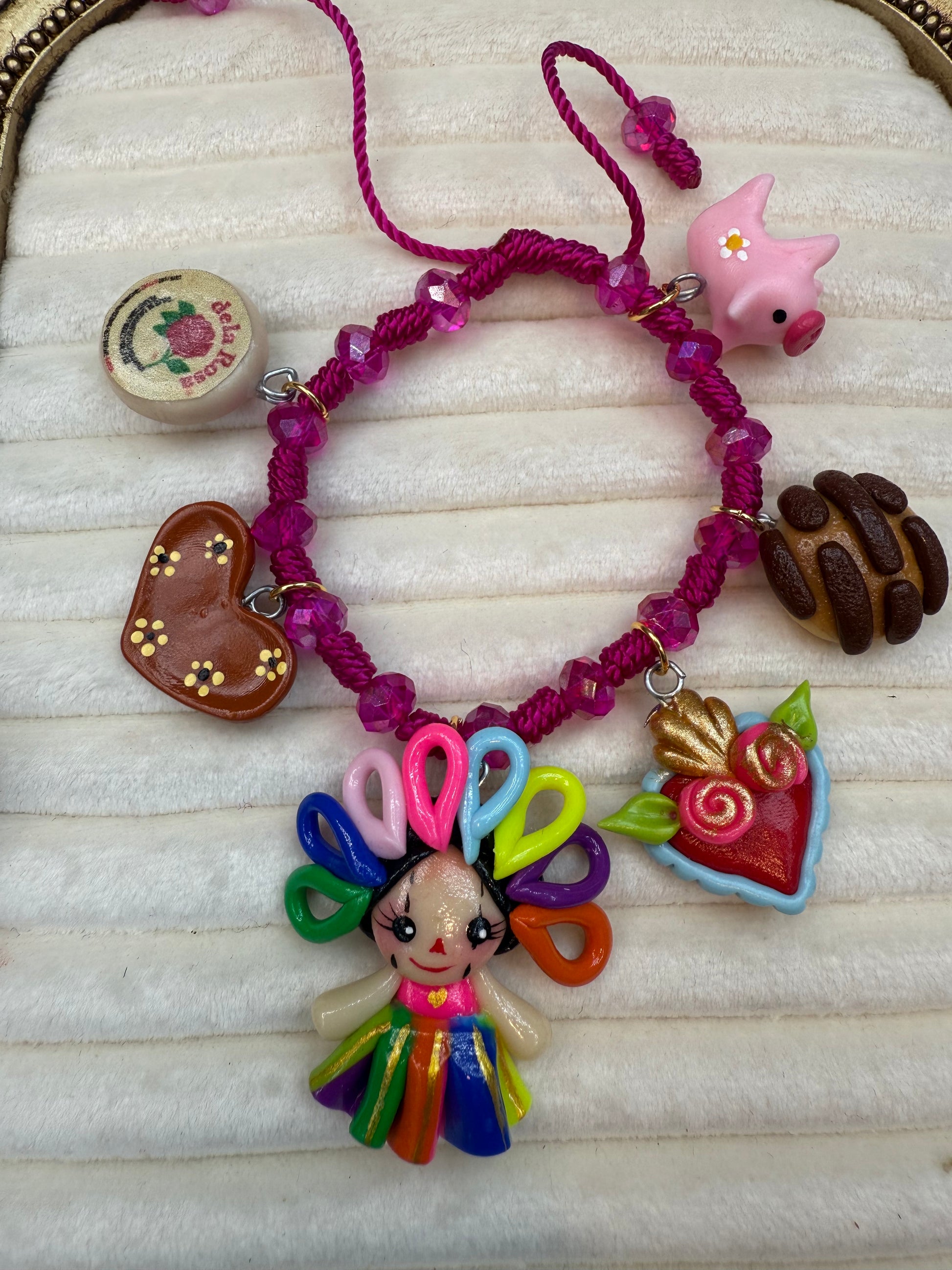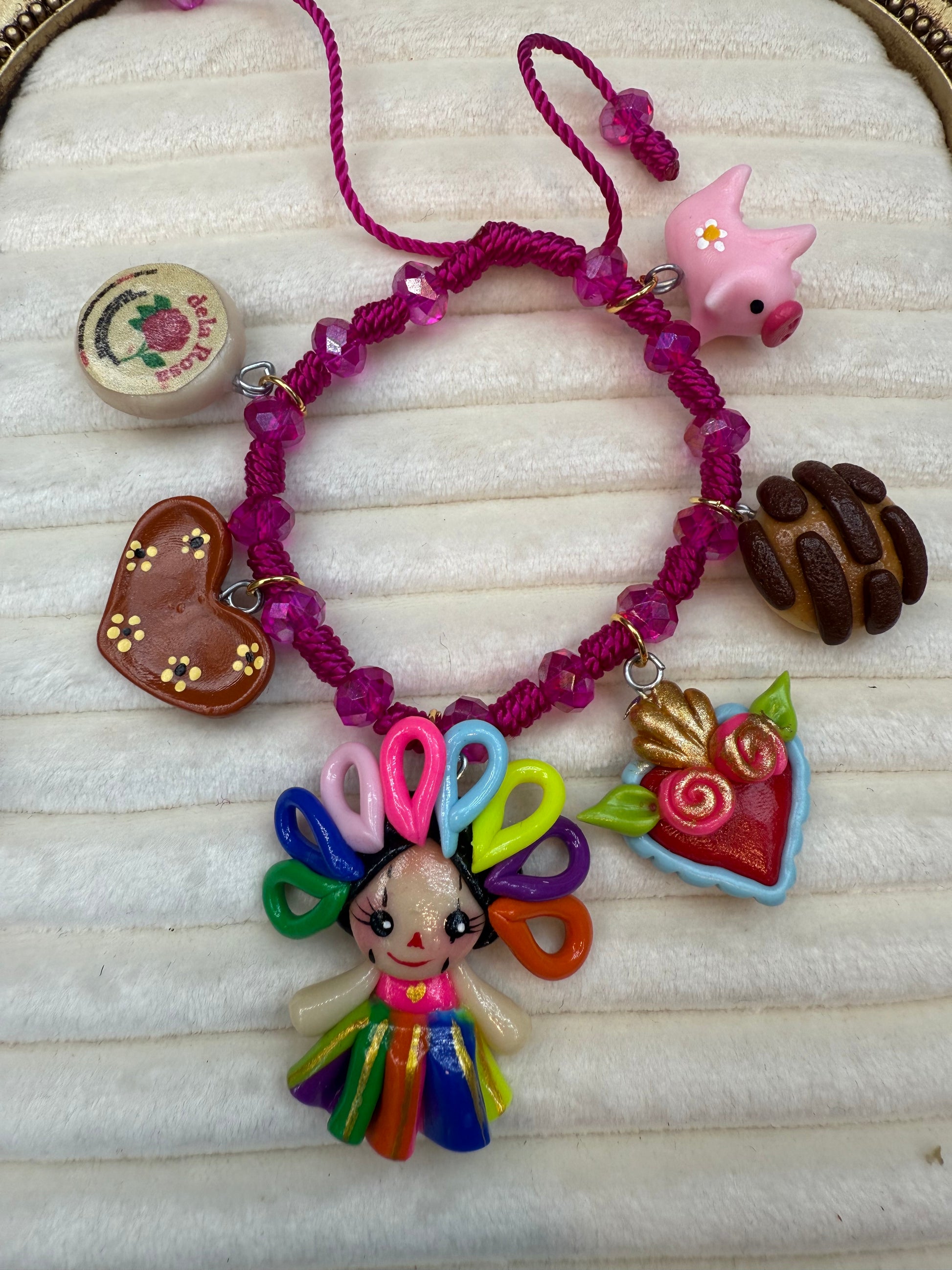 Pulcera ajustable de hilos y cristal checo , adornada con dijes de pasta flexible con tematica de dia de muertos . Cultura mexicana ❤️