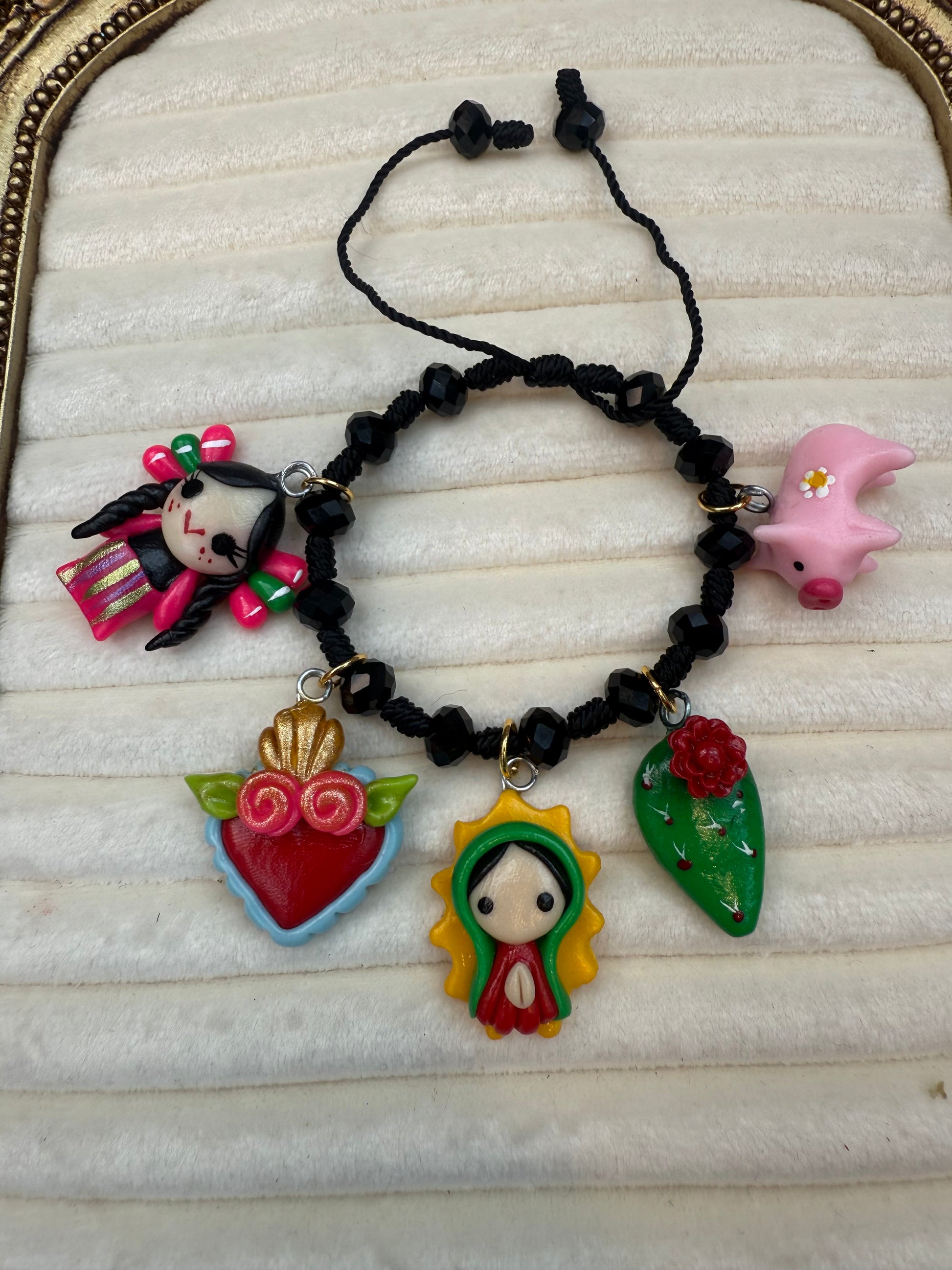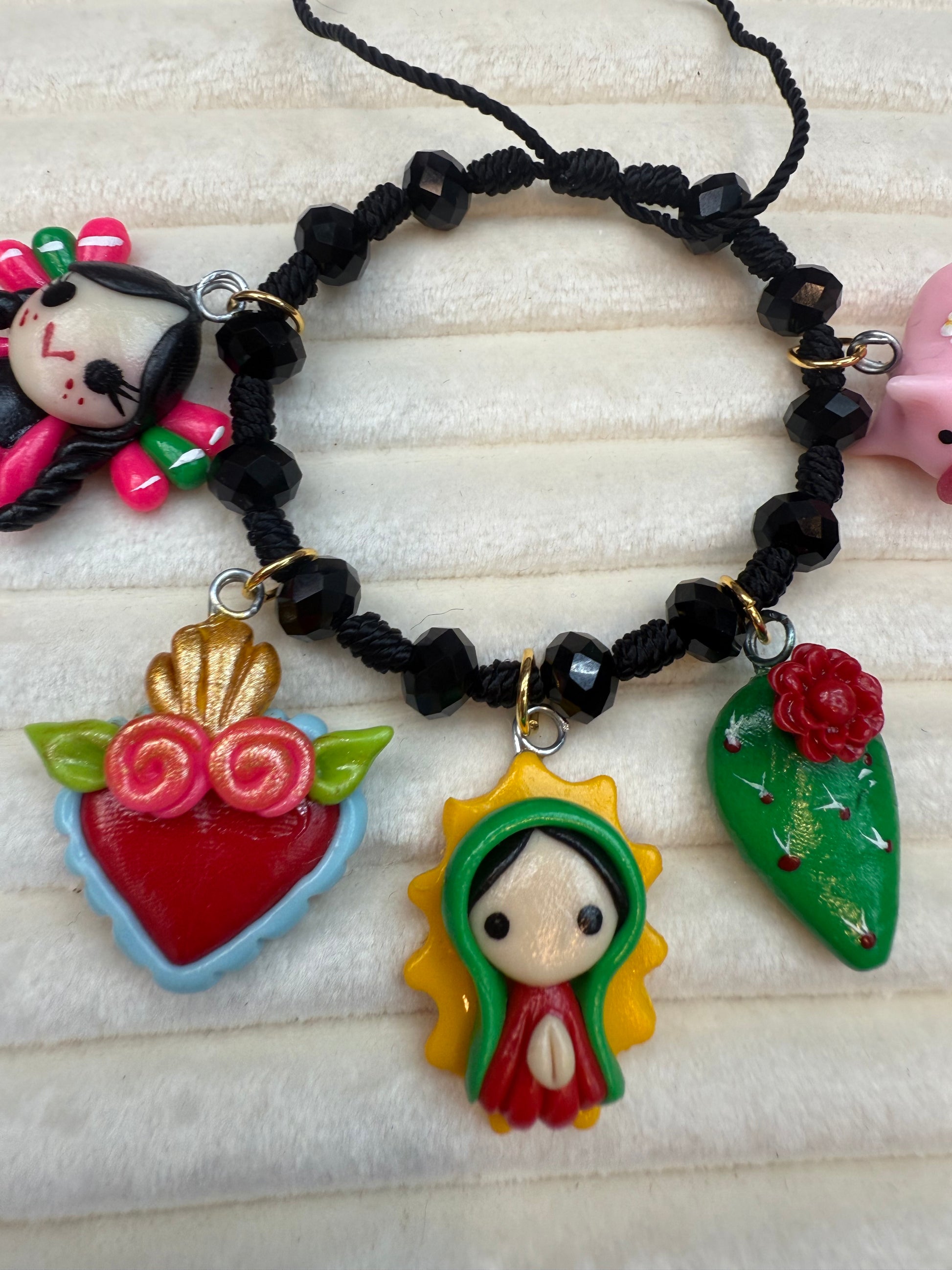 Pulcera ajustable de hilos y cristal checo , adornada con dijes de pasta flexible con tematica de dia de muertos . Cultura mexicana ❤️