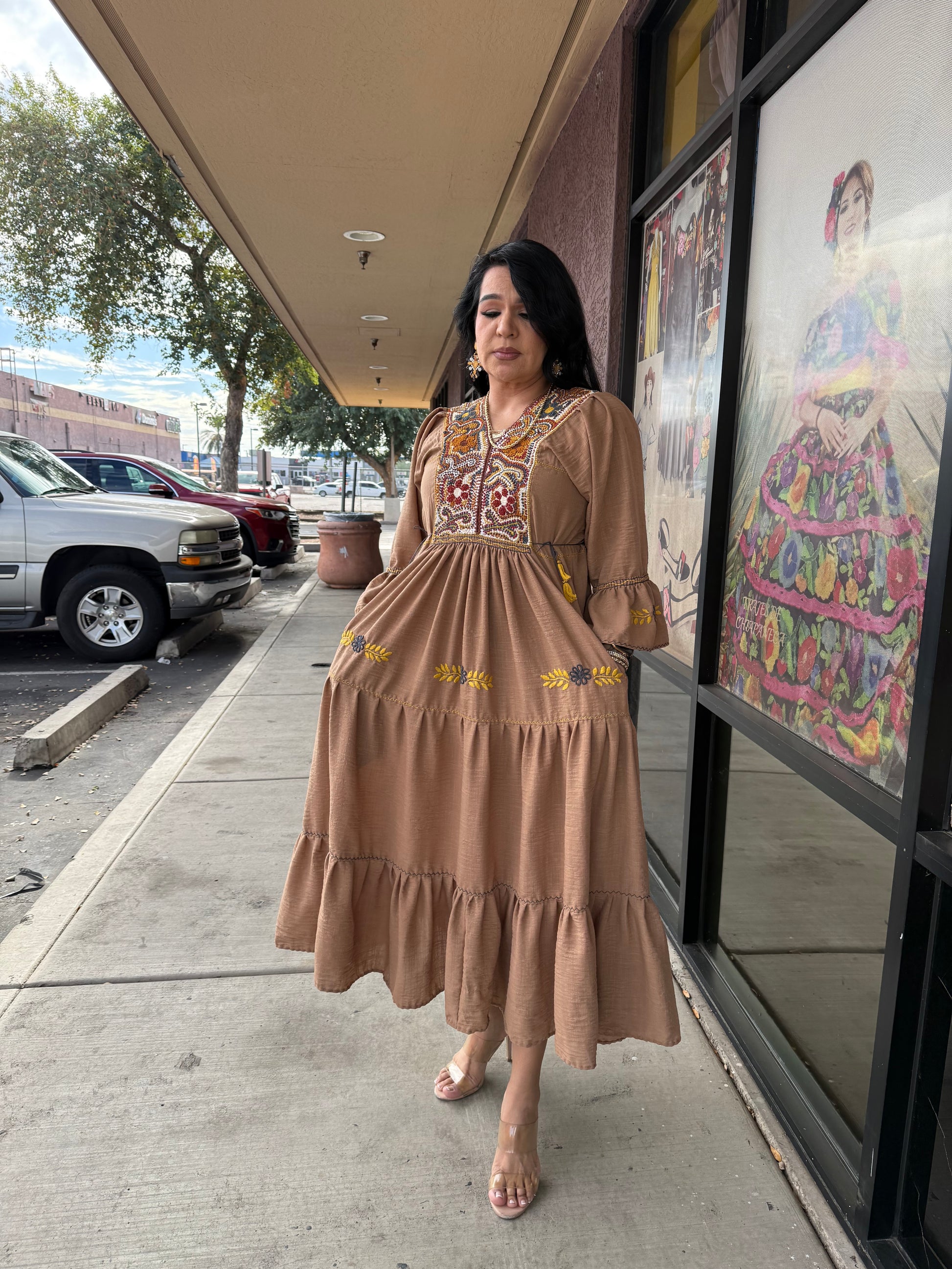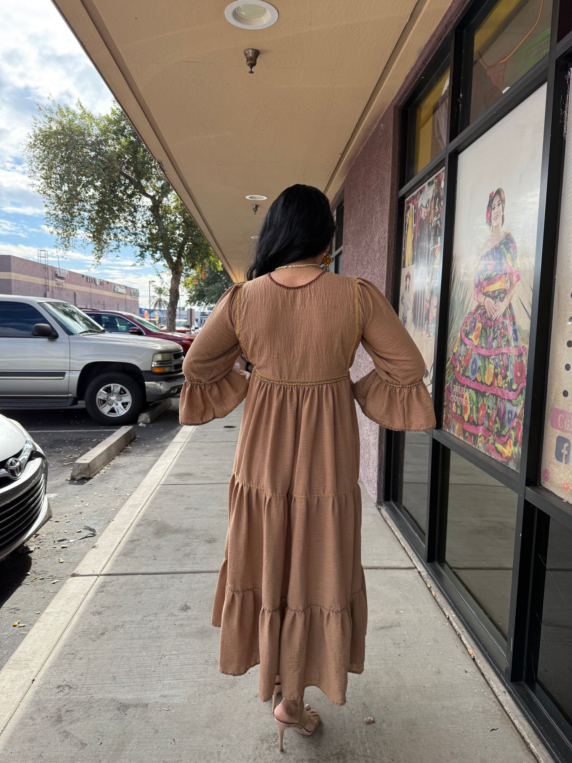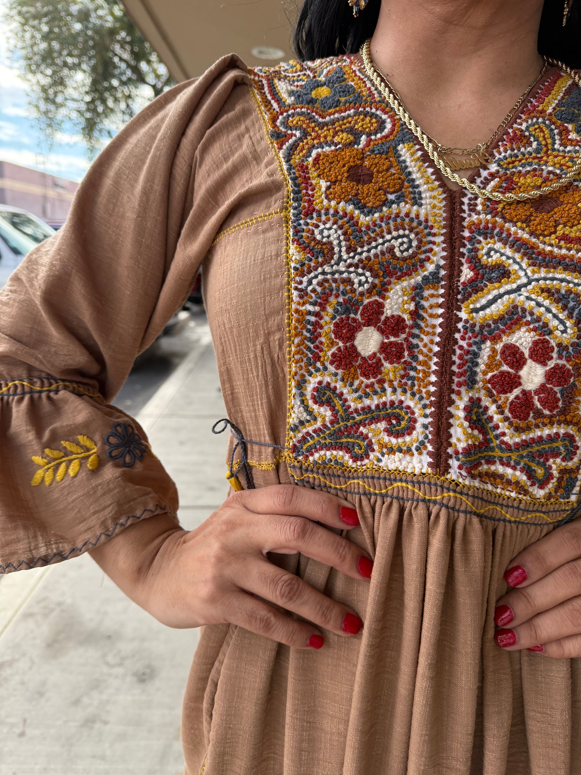 Vestido Artesanal Mexicano Bordado a Mano Tipo Rococó – lino Café | Talla Única Ajusta