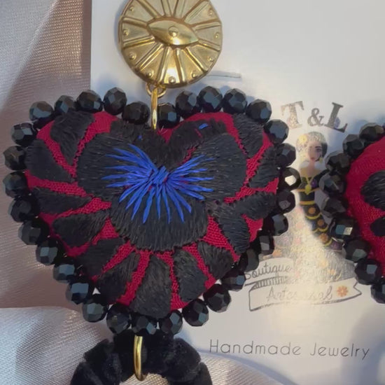 Estos aretes artesanales son una pieza única que combina tradición, simbolismo y diseño contemporáneo. El corazón está bordado completamente a mano con la técnica tradicional de San Antonino, originaria de Oaxaca, reconocida por su detalle y riqueza cultural.