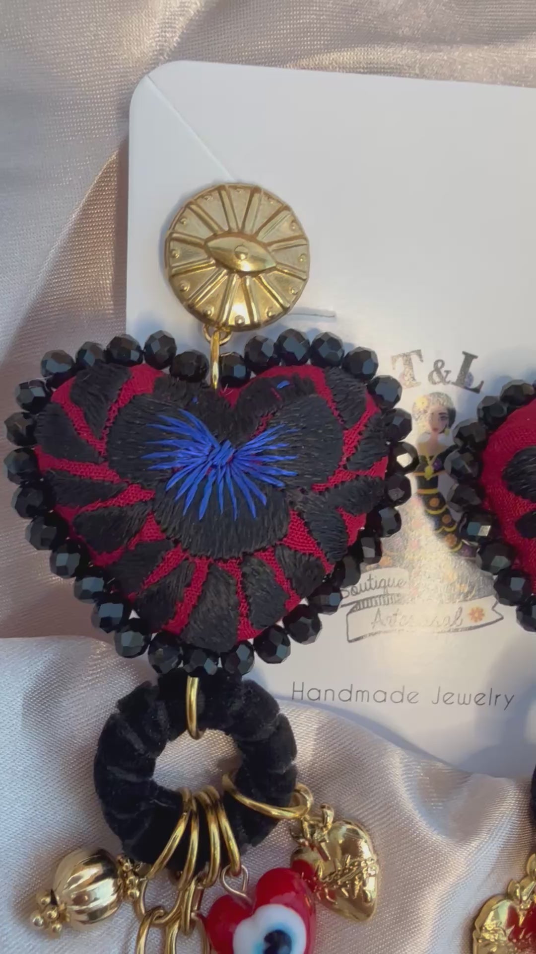 Aretes Corazón Bordado a Mano San Antonino con Ojos Protectores | Acero Inoxidable | Artesanía Oaxaqueña Ligera